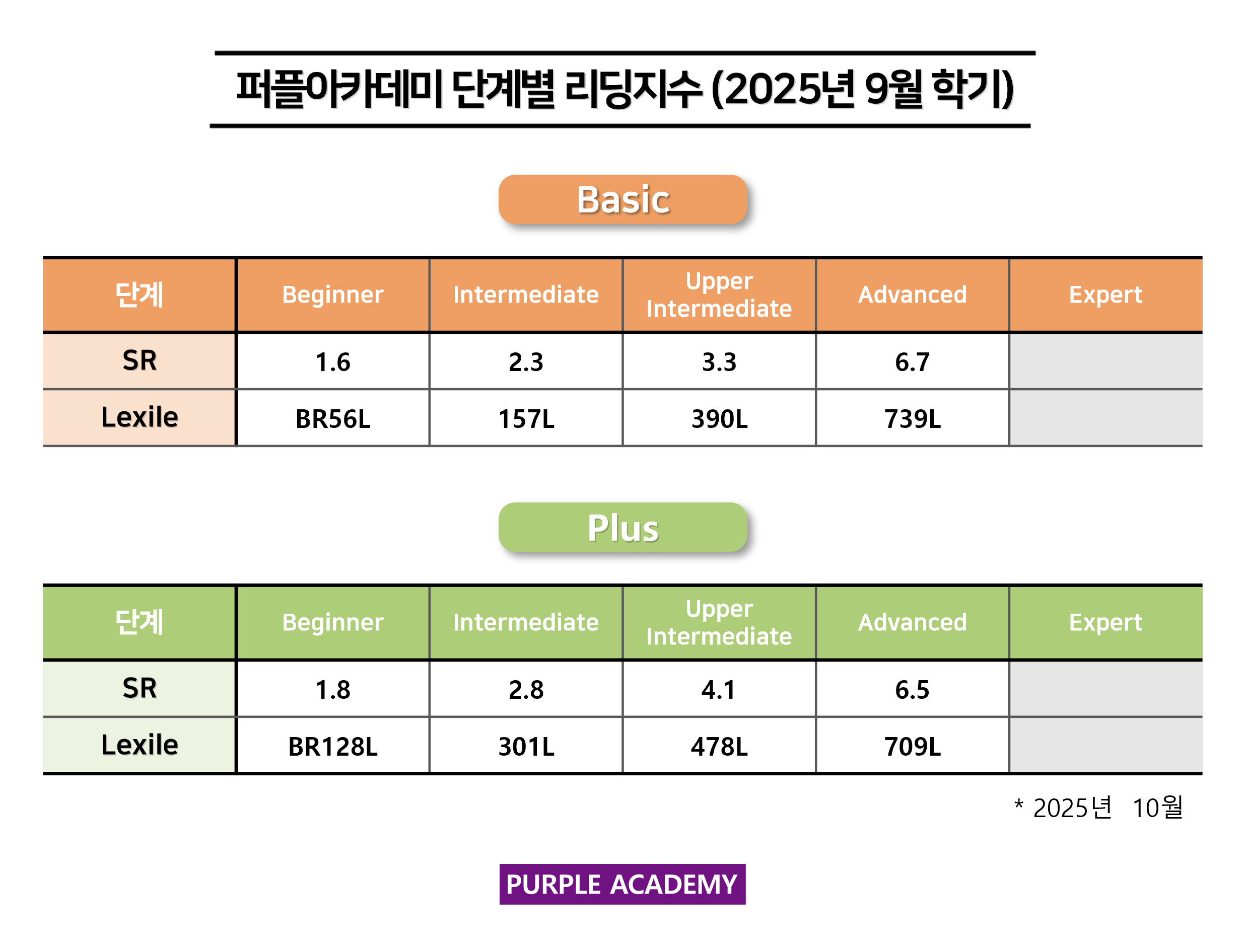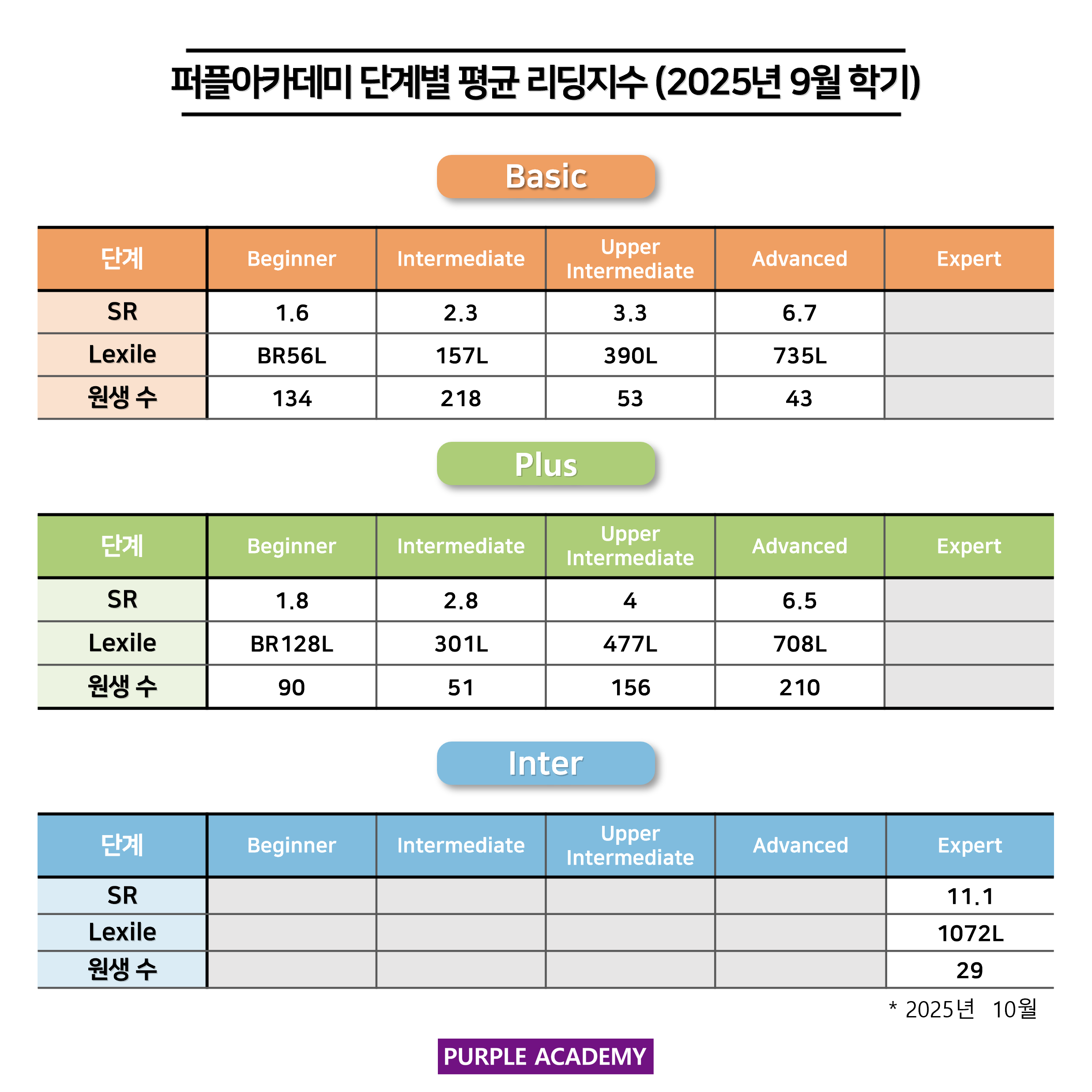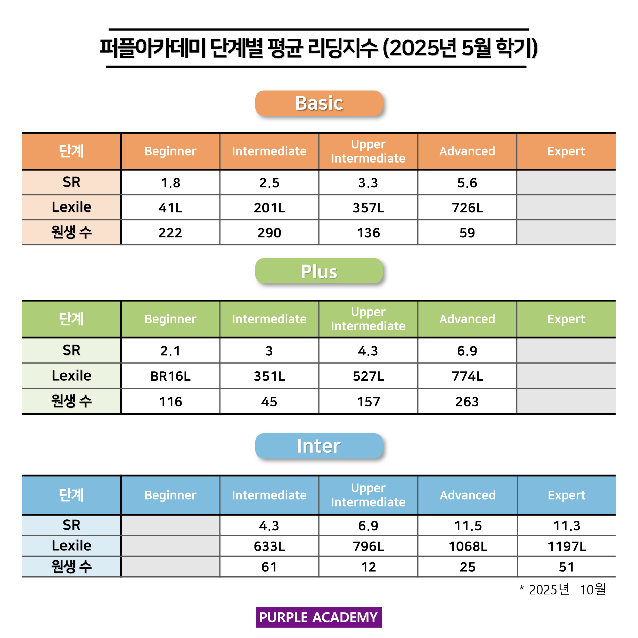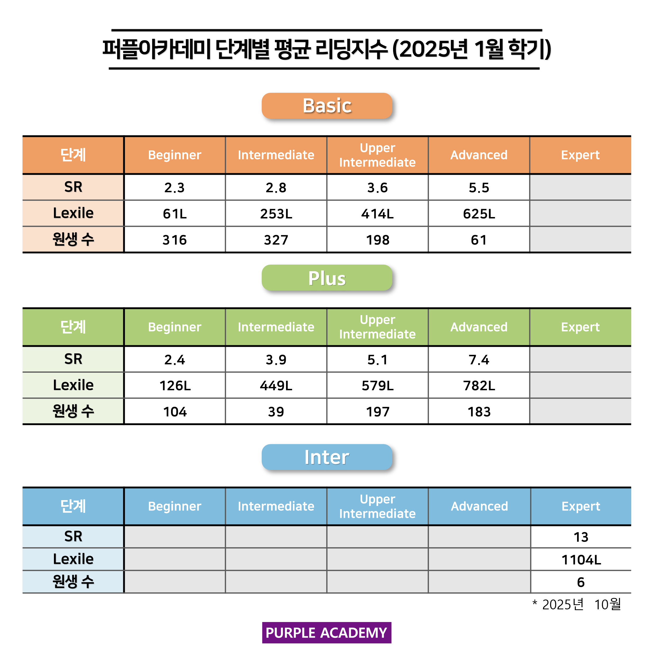 퍼플 Kids의 학기별, 단계별 2025년 10월 리딩 지수를 공개합니다!