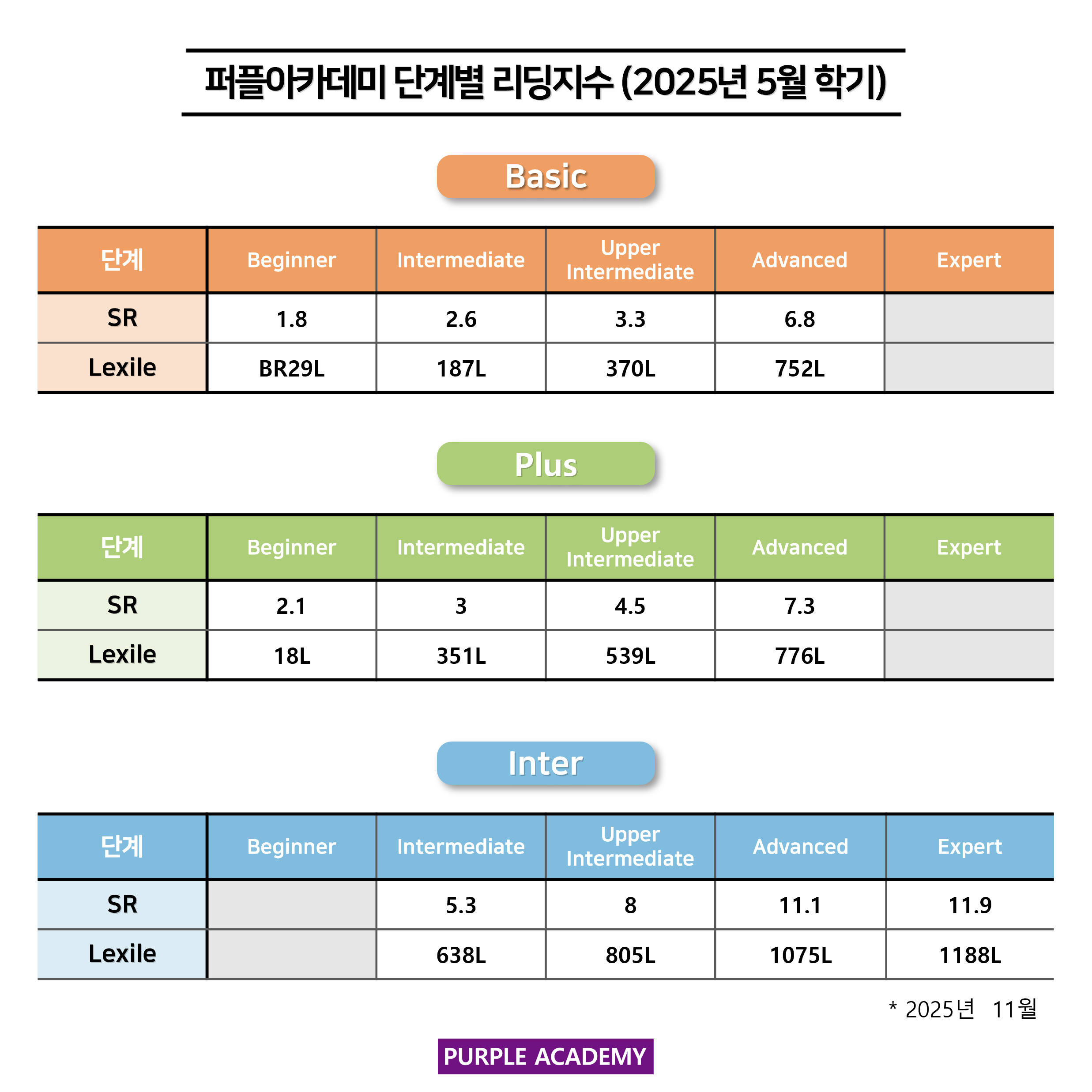 퍼플 Kids의 학기별, 단계별 2025년 11월 리딩 지수를 공개합니다!