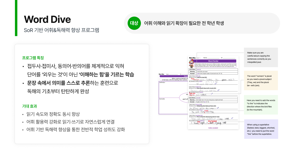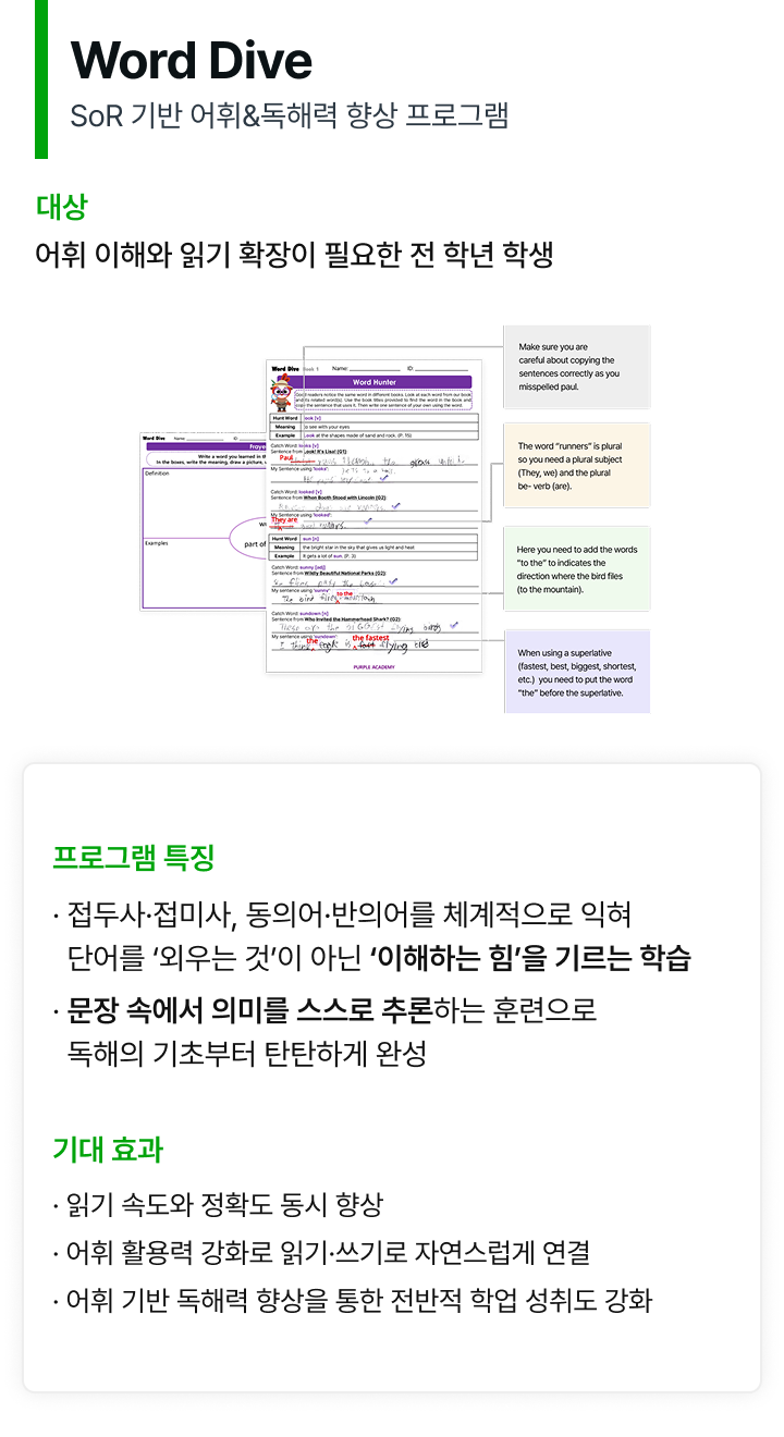 개인별 맞춤 특강으로 실력을 쌓고, 4대 영역 듣기·말하기·읽기·쓰기의 균형 잡힌 성장을 통해 글로벌 환경에서 당당히 소통하는 역량을 키워줍니다.